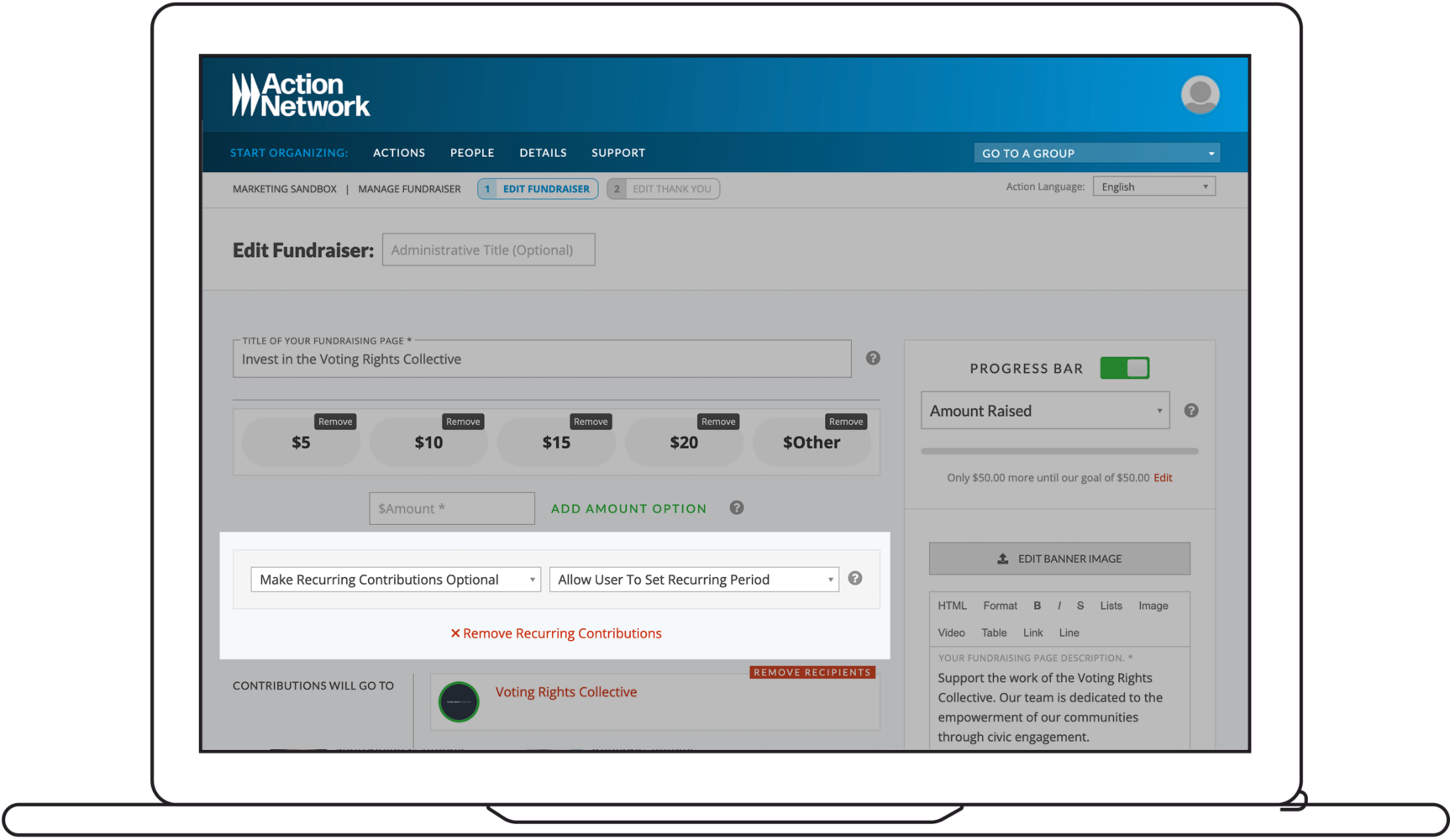 Decide whether you'll accept recurring donations alongside one-time donations. Make it easy for supporters to give monthly if you’d like.